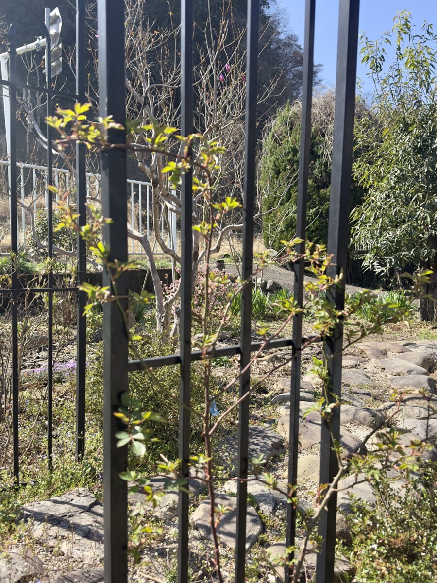 アーチに誘引したバラやクレマチス、芍薬も芽吹いてきています*